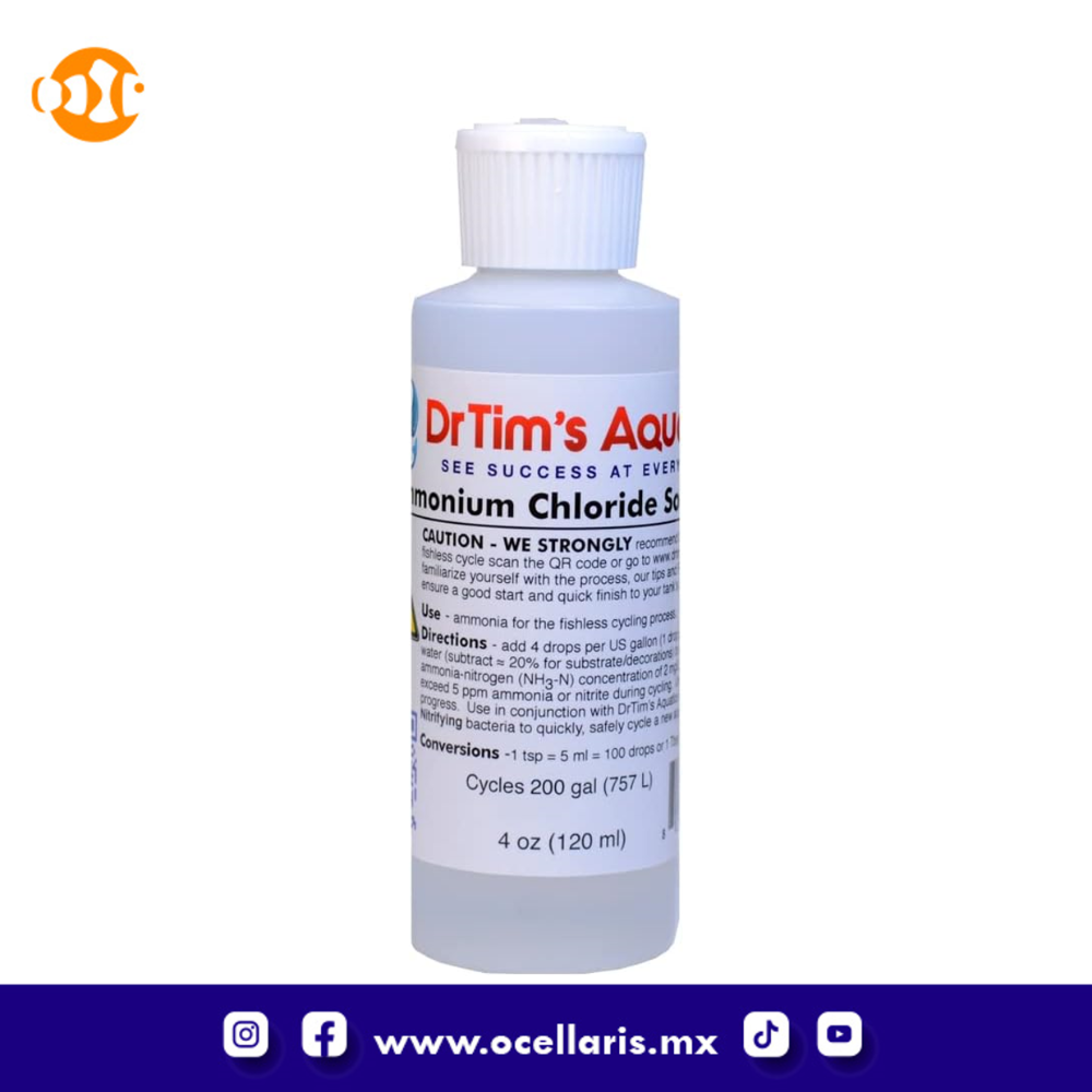 El cloruro de amonio se puede utilizar para simular la materia orgánica que se descompondría naturalmente en amoníaco. Al agregar la solución de cloruro de amonio de grado reactivo a su tanque en lugar de métodos más antiguos, como usar un pez barato o agregar comida para peces rica en nutrientes, no tiene ninguno de los subproductos que producirán la comida para peces en descomposición y los desechos de peces. La fórmula del Dr. Tim es diferente de las soluciones tradicionales de cloruro de amonio que encontraría en su supermercado o ferretería local. La mayoría de las soluciones de amoníaco contendrán aditivos no deseados para ayudar con el olor y la coloración, el aditivo del Dr. Tim utiliza amoníaco puro.
