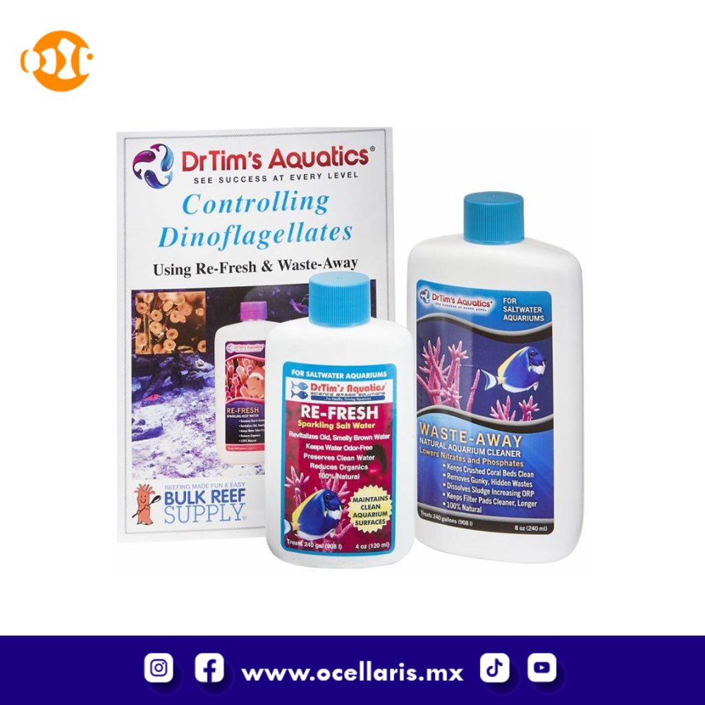 El régimen de tratamiento del Dr. Tim, que utiliza las cepas bacterianas de Re-Fresh y Waste Away, forma una parte importante de la solución a los dinoflagelados al crear condiciones menos hospitalarias para ellos, así como una competencia por el espacio y los recursos. Combinado con un período de apagón en el acuario y la eliminación física con cambios de agua, esto generalmente estresará o matará a los dinoflagelados e inclinará las cosas hacia un equilibrio saludable de microorganismos.